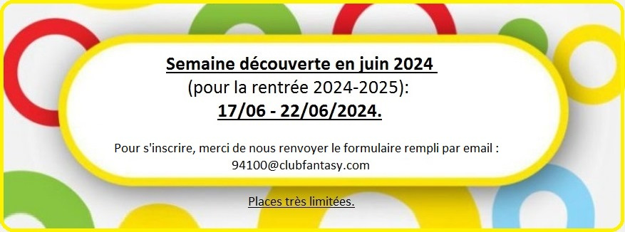 Club Fantasy se réserve le droit de ne pas honorer jusqu'à 1 cours dans l'année, sans proposer de remplacement ou de remboursement (maladie, grève, etc).